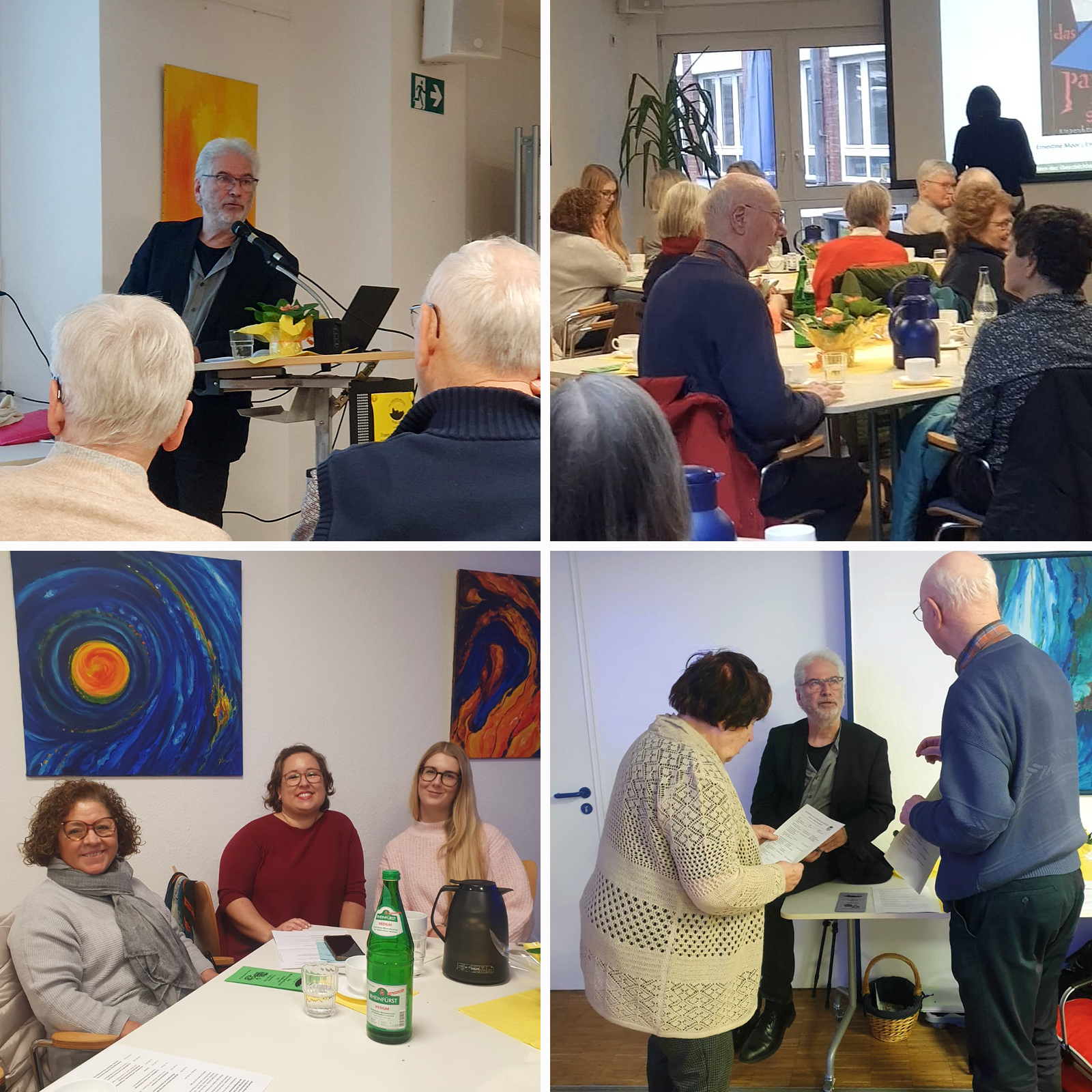 Der ParitätischeFriedhofstr. 39 41236 Mönchengladbach-Rheydt ![]() Oben links und unten rechts: Hans Schürings berichtet über Mönchengladbacher Frauen. Unten links: Die Organisatorinnen und Moderatorinnen der beiden Januar-Erzählcafés: Janine Omraie-Reina (mitte) und Hannah Gieselmann (rechts)